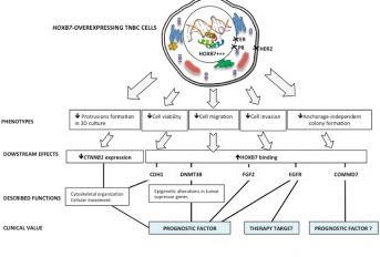 Os genes HOX codificam proteínas do tipo “factores de transcrição” que são de extrema importância durante o desenvolvimento embrionário. No entanto, parecem ter um papel também relevante na vida pós-embrionária e a desregulação da sua expressão está inúmeras vezes associada à progressão tumoral e à resistência terapêutica manifestada por alguns doentes. O gene HOXB7, em particular, desempenha um papel importante na progressão do cancro de mama de uma forma dependente do subtipo molecular. Neste trabalho foi induzida a sua sobre-expressão em células MDA-MB-231, um modelo celular do subtipo Triplo-Negativo, o mais agressivo e mortal, e foram avaliadas as mudanças fenotípicas na viabilidade celular, morfogênese, migração, invasão e formação de colánias. Surpreendentemente, encontraram-se consistentemente comportamentos menos agressivo representado por menor viabilidade celular, inibição da migração celular e invasão. Foram também avaliados os impactos em alvos a jusante e verificou-se que nas células manipuladas o factor de transcrição HOXB7 se ligava mais a genes como o CTNNB1, EGFR, FGF2, CDH1, DNMT3B, TGFB2 e COMMD7. Tomados em conjunto, estes resultados destacam a plasticidade da função HOXB7 no cancro de mama, de acordo com o fundo genético celular e os níveis de expressão, e fornecem evidências de que em células de cancro de mama Triplo-Negativo, a superexpressão de HOXB7 tem o potencial de promover fenótipos menos agressivos.
