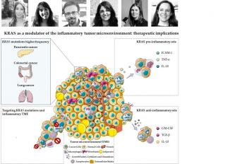 As mutações do gene KRAS são mutações oncogénicas frequentes em cancro, com maior prevalência em cancro pancreático, colorretal e de pulmão. Vários estudos têm sido desenvolvidos de forma a explorar o efeito das mutações KRAS, não somente no tumor, mas também no microambiente tumoral. A relevância do estudo do microambiente tumoral tem vindo a crescer devido ao seu já reportado impacto na modulação da atividade de células tumorais, ditando o sucesso da progressão tumoral. Assim, com esta revisão pretendemos apresentar novas perspetivas sobre o papel pro- e anti-inflamatório das mutações do KRAS na modulação do microambiente tumoral, abrindo horizontes para diferentes combinações terapêuticas de forma a ultrapassar a ineficácia e resistência à terapia associada às mutações do gene KRAS.