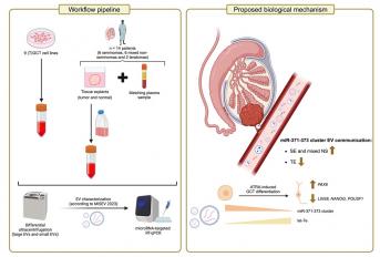 Os tumores de células germinativas do testículo (TCGT) são os tumores sólidos mais comuns em adultos jovens do sexo masculino. O cluster de microRNAs 371-373 é considerado um biomarcador específico destes tumores, com exceção da histologia de teratoma. Dos microRNAs que constituem este cluster, o miR-371a-3p apresenta sensibilidade e especificidade excecionais na deteção de TCGT, ultrapassando as limitações dos marcadores tumorais séricos clássicos usados na rotina (HCG, AFP, LDH). O seu potencial como biomarcador foi já demonstrado em diversos estudos retrospetivos e prospetivos, conduzindo à sua aprovação como teste de diagnóstico com marcação IVDR, sendo realizado no Serviço de Anatomia Patológica do IPO Porto, desde agosto de 2024, para diagnóstico e monitorização dos doentes com TCGT. Contudo, e apesar da utilidade clínica inquestionável, a função biológica destes microRNAs e os seus mecanismos de secreção são, ainda, amplamente desconhecidos. O presente estudo, desenvolvido recentemente no Grupo de Epigenética e Biologia do Cancro do Centro de Investigação e no Serviço de Anatomia Patológica do IPO Porto, em colaboração com a Clínica de Urologia e com investigadores das Universidades de Cornell e da Califórnia em San Diego (EUA), procurou compreender melhor a biologia destes microRNAs. Os autores isolaram e caracterizaram vesículas extracelulares (VE) - essenciais na comunicação celular - libertadas por vários tipos de amostras de modelos pré-clinicos e clínicos, incluindo linhas celulares, tecido e plasma de doentes com TCGT, e avaliaram os níveis de miR-371-373 e let-7e transportados nestas VE.